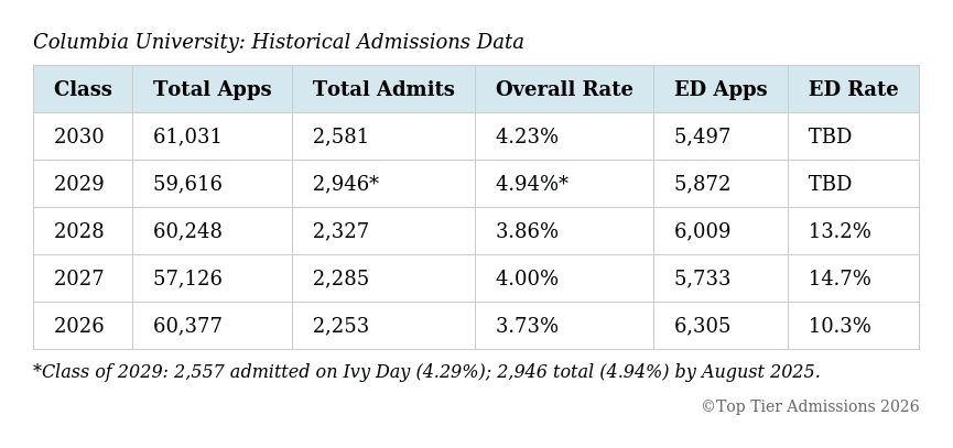 - Columbia University Acceptance Rate: Class of 2030 - April 17, 2026